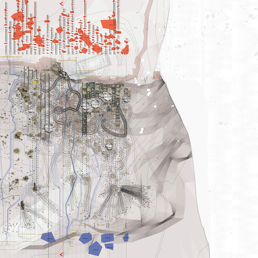 It is possible to calculate, with varying degrees of indeterminacy, the original position and orientation of each stone that has fallen from Agrigento’s ancient city wall. Any computer analysis of this data will necessarily create multiple potential ‘true’ arrangements for restoration. In this allegory of the Sisyphean futility of our attempts to reconstruct the classical world, Petrides proposes that the fallen boulders of the ruined city wall should be eternally rearranged in the landscape by machine and man.