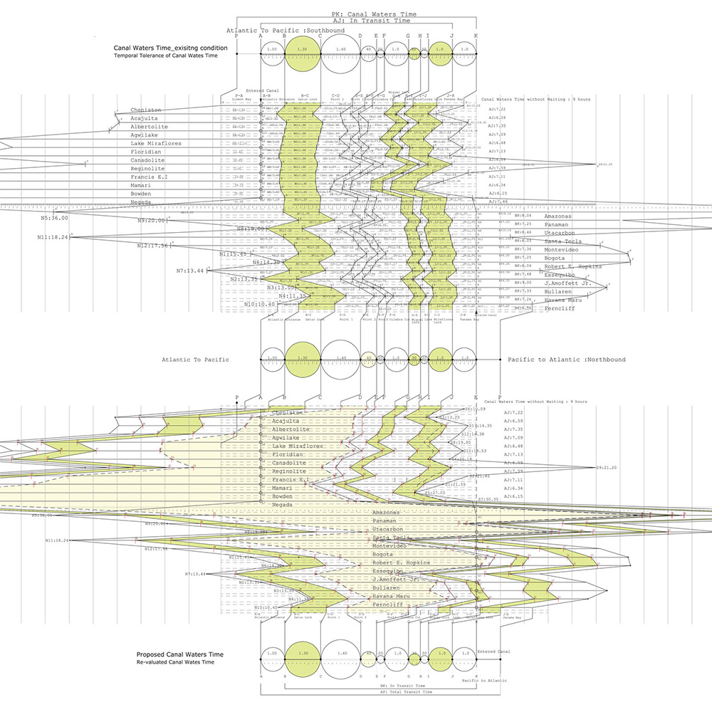 The waiting time in international waters at either end of the canal is relocated to the centre of the transit through locks in Gatun Lake. Thus in this drawing of time, transit and space, the canal’s middle swells with waiting: the site of trading.