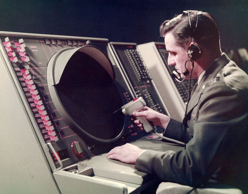 Military operative using the Semi-Automatic Ground Environment (SAGE) light-gun to input information into, or delete hostile bombers from, the onscreen representation of US Cold war airspace in 1961. Image: The MITRE Corporation.